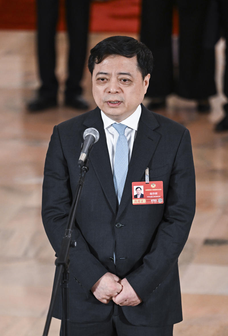 3月7日,全国政协十四届四次会议第二场“委员通道”集体采访活动在北京人民大会堂举行。这是全国政协委员南存辉接受媒体采访。新华社发