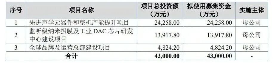 此次IPO,计划募资用于先进声学元器件和整机产能提升项目、全球品牌及运营总部建设项目等。