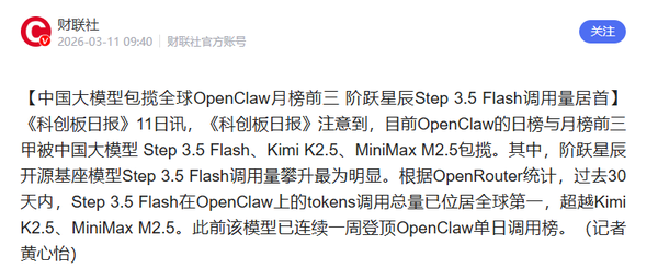【CNMO科技消息】近日,据才脸色报道,过去30天内,OpenClaw的日榜与月榜前三甲被中国大模型Step 3.5 Flash、Kimi K2.5、MiniMax M2.5强势包揽。其中个人配资炒股配资,阶跃星辰开源的基座模型Step 3.5 Flash表现最为抢眼,其tokens调用总量已位居全球第一,超越Kimi K2.5、MiniMax M2.5。此前该模型已连续一周登顶OpenClaw单日调用榜,成为本轮国产AI热潮中的最大黑马。